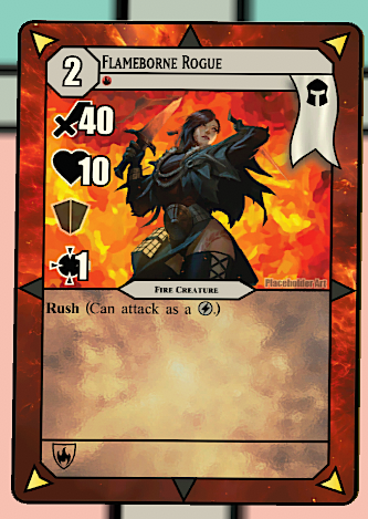 Flameborne Rogue: Aggressive creature with Rush, allowing for quick attacks. Can deal burst damage when refreshed.