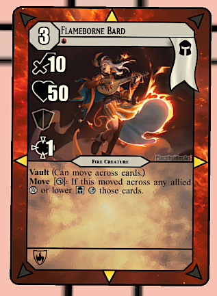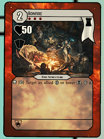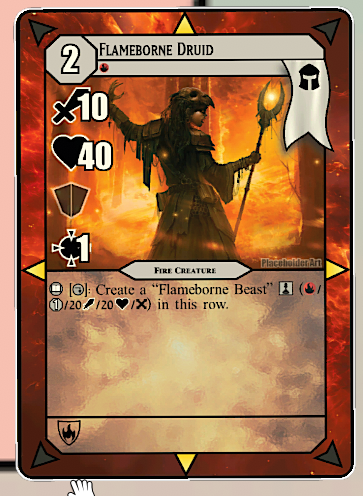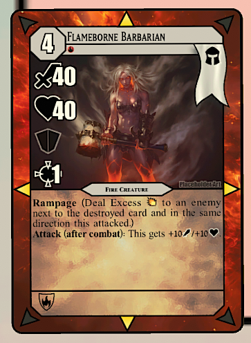 How Flameborne expresses elemental themes and mechanics: Fire is an aggressive element focused around attacking. To get value out of refreshing creatures (bringing them out of an exhausted, or ‘used up’ state) players are incentivized to move creatures forward onto the enemy field so they have more targets for attack.